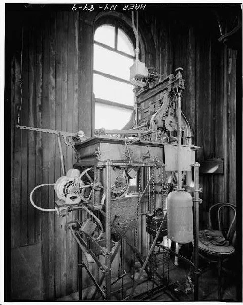 It took over an hour for two men to make about eight hundred and fifty turns to wind the seven hundred feet long, three inch thick rope that hoisted the 800, 1200, and 1500 pounds weights that powered the mechanism. The largest weight had a drop of fifty-feet, and if not for the bales of hay placed below it, serious damage to the foundation of the church would have resulted when the rope broke about a quarter century after the clock was installed. A local watch repairman by the name of Henry Fick was one of the men charged with the job of winding and servicing the clock for a better part of the nineteenth century. He was also contacted in the wee hours of the morning for an emergency repair on the first Christmas of the twentieth century when the clock stopped just a few minutes after midnight. To the people who lived in the neighborhood, the stopping of the clock was considered ominous, even taken as a sign that someone in the congregation would die within the week – no one actually died – a prevalent superstition of the time whenever a community clock stopped. Fick was able to get the mechanisms working again, but over the next few years more problems ensued.