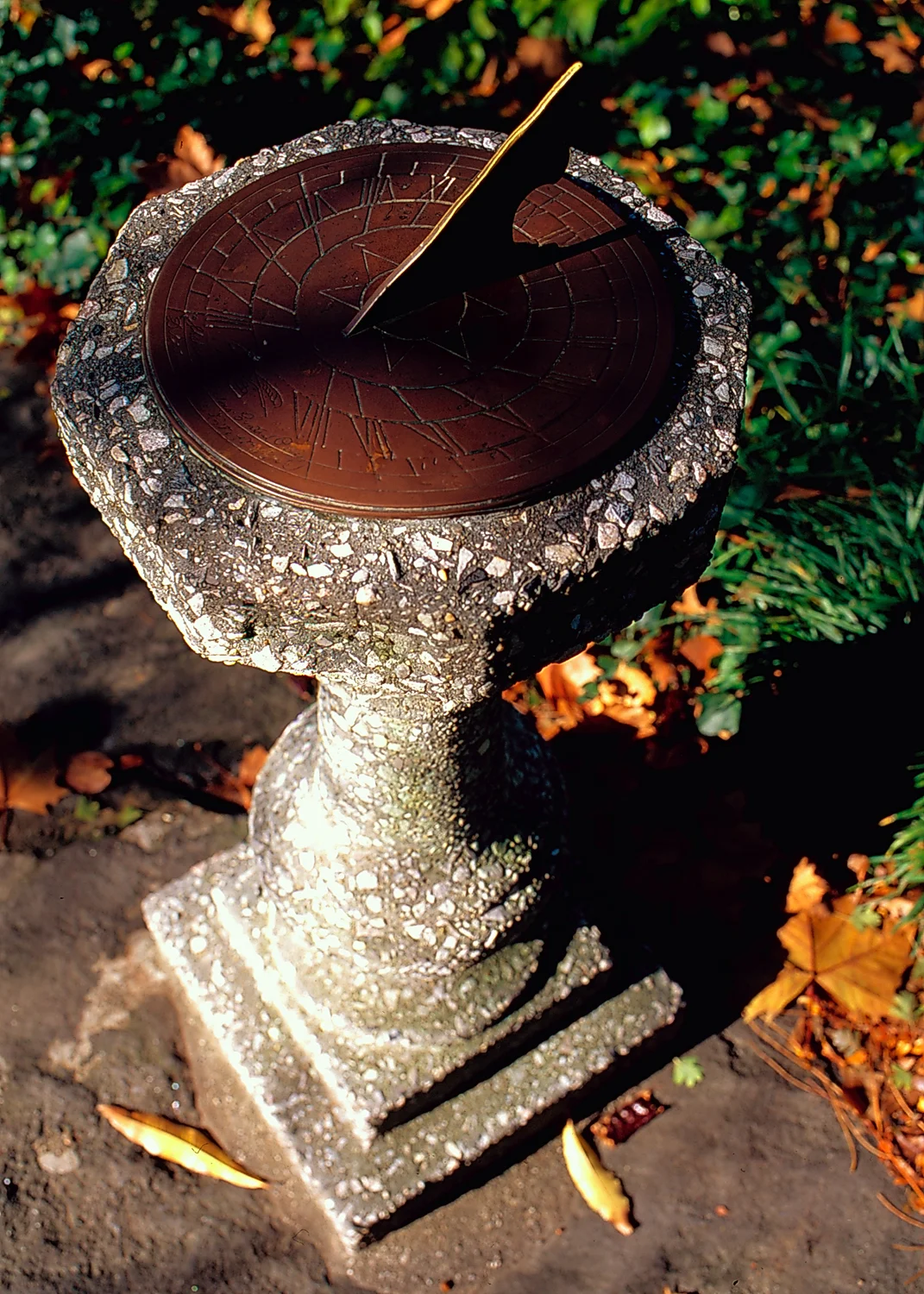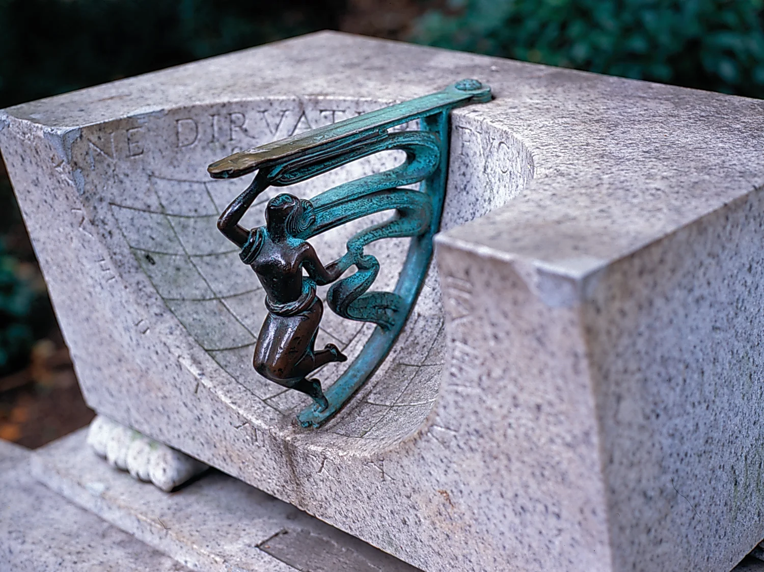 Sundial enhances the Shakespeare Gardens on the west side of Central Park at the base of Belvedere Castle. The gnomon on the four-foot tall, stone sundial faces north, a principal discovered by the Greeks that allows for precise time-tracking.