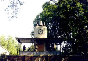 The hammer and the bell which it strikes are located in a chamber above the clockwork. This chamber has louvers on all four sides which allow the sound to go out while minimizing the entry of rain and snow. The bell, weighing 5,000 pounds, is twice the size of the Liberty Bell. It was cast for the Howard company by the McShane Foundry of Baltimore in 1897. On the hour one can observe how a lever, attached to the works, pulls on a cable which activates the hammer in the room above.