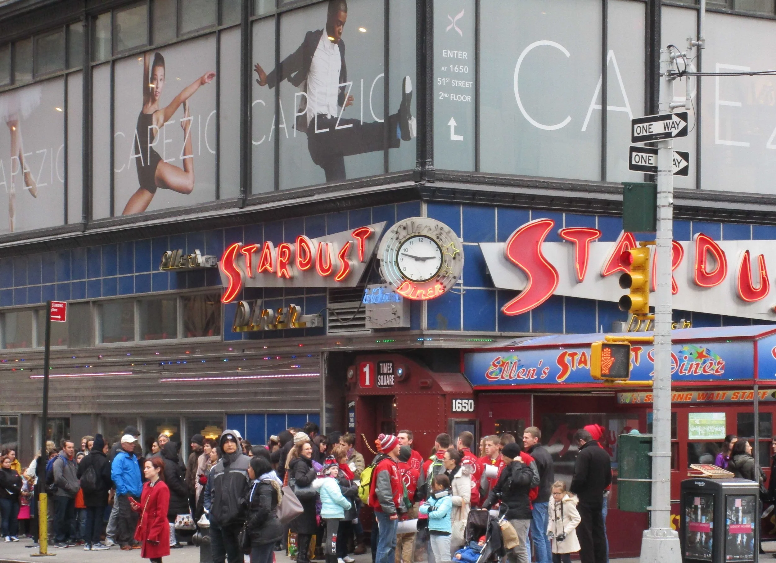 The clock on top of the Paramount Theatre was not only the highest point in Times Square, but once the highest point in all Manhattan north of the Woolworth Building in lower Manhattan. Today, the large clock face and globe are still one of the area's nicer sights despite the many new buildings. It is a working illuminated tower clock with 5-pointed stars in place of numerals.