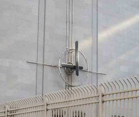 Less traditional is the McGraw Hill Sun Triangle in the sunken plaza in front of the McGraw-Hill Building. This very interesting fifty-foot high stainless steel sculpture denotes the passage of seasonal time by showing the relation between the sun and earth at the solstices. The three sides of the metal triangle point to the three seasonal position of the sun at solar noon in New York. The shortest side at the bottom points to the sun’s lowest position on the winter solstice around December 21. The longest side points to the sun’s position on the spring and fall equinox at noon around March 21 and September 23. The diagonal side points to the sun’s highest position on the summer solstice at noon around June 21. Perhaps, the most impressive feature of the triangle’s designs is that it casts during certain some parts of the year both a regular shadow as well as an “anti-shadow” resembling two hands of a clock on the plaza below. Next to the triangle is a depiction of the solar system engraved in the ground.