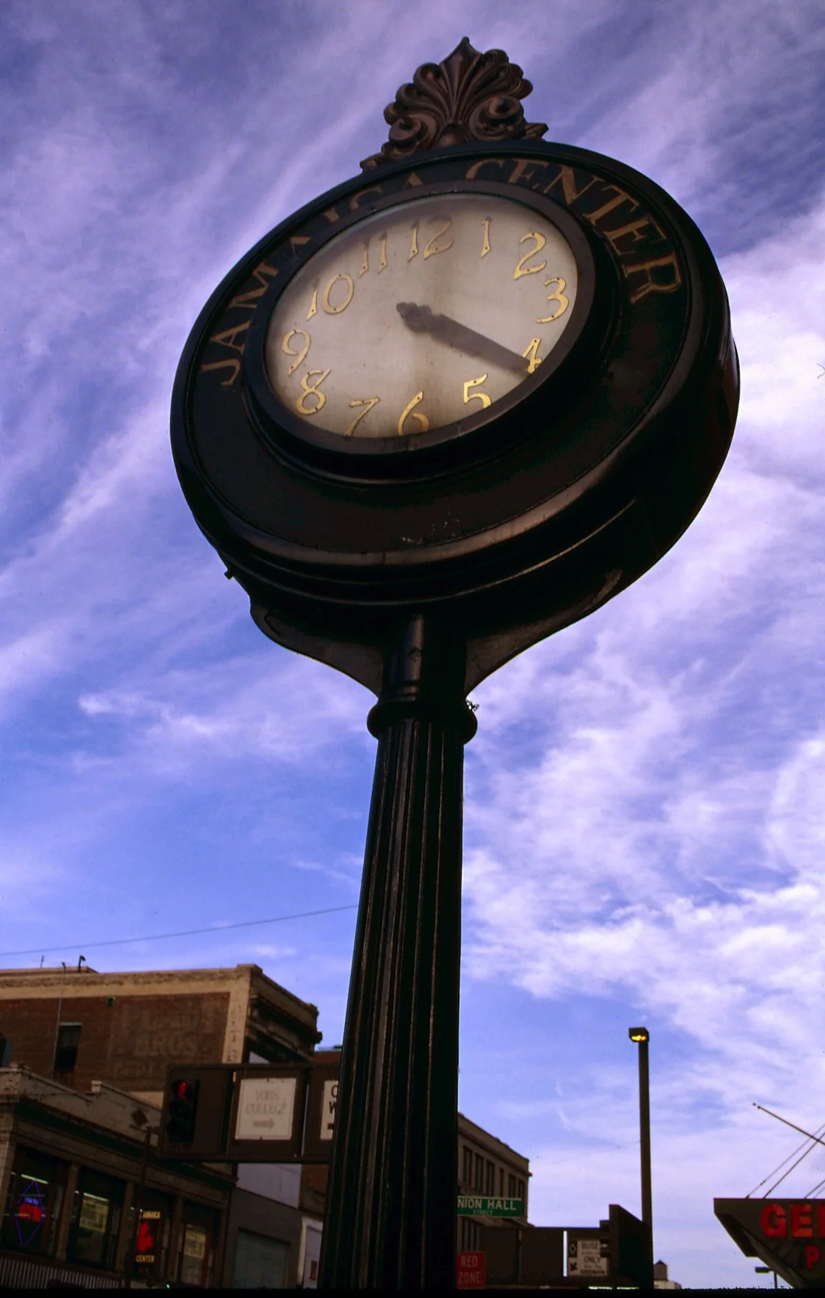 Originally erected in 1900 at 161-11 Jamaica Avenue, the clock was designated a New York City landmark in 1981. It is double-faced with a cast-iron paneled base, fluted column post, and splendid acroteria motif crowning the clock face. It was restored and moved to its present location at 92-00a Union Hall Street in 1989. The descriptive plaque was installed in the wall of the bank building below the one placed by the Daughters of the American Revolution for the Old stone church. Originally placed in front of Busch's Jewellers, it is 15 feet high to the top of the finial, and was similar to other cast-iron post (tower) clocks produced between 1881 and 1910 by the E. Howard Clock Company and the Seth Thomas Clock Company.